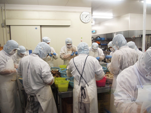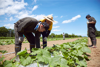 芽室町の中心街から車で15分ほど走ると、周囲を豊かな自然に囲まれた場所に、九神ファームめむろの嵐山工場がある。嵐山工場では農業と農作物の一次加工をしており、障害のある人が従業員として勤務し、各種作業を担当している。勤務時間は9時半から5時(※)。ほとんどの従業員が自宅までの送迎バスを利用して工場に通う。