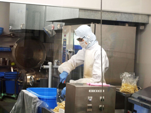 皮むき ⇒ 芽とり ⇒ カット ⇒ 計量・袋詰め ⇒ 真空処理 ⇒ 蒸す ⇒ 冷やす