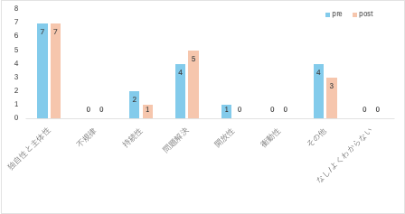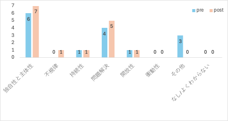 子どもの創造性についても「独自性・主体性」は実践前後で7名ずつ、「問題解決」については実践前4名、実践後に5名が言及した。なお、子どもの創造性については事前と事後にも既存のカテゴリに当てはまらない発言が複数の教員から得られた。例えば、教員5は事前には「前向きに取り組んでいける子」と述べ、事後には「自信を持つこと」を挙げた。また、教員7は事前には「軸を持っている(中略)それが好きな自分にすごく自信がある」と述べ、事後には「創造性以外の能力も(創造性を発揮するために)必要」と述べた。教員10は事前には「お友達の話聴きながら、こうしたらいいよねみたいなことが何か発言できるような子」と述べ、「創造に対する責任とかそういうことがない」ことを挙げていた。その他であげる創造性の特徴については、一貫した発言をする教員もいる一方で、各教員でそれぞれの特徴の捉え方や解釈が変わる様子も見られた。