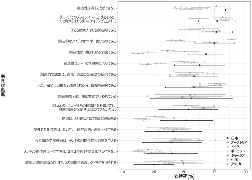 6カ国の平均点を比較すると、国際平均を上回る日本人の高い承認率は、Big-Cバイアス、固定的なマインドセット、アートバイアスの他に、最も承認されていた記述として「創造性は測定できない」があった。この創造性神話の信念を根強く持っている場合、研究に基づく教育現場や職場で創造性の測定方法が示されたとしても、創造性の測定に否定的になる可能性がある。また、「子どもは大人よりも創造的である」という考えは、子どもの創造性を承認する傾向として捉えられる反面、創造性に関連する知識やスキルの量が、発達段階を超えて増加するという報告(Barbot et al., 2016)とは異なる理解を招き、それを促す教育を軽視することにもなりかねない(Beghetto, 2019)。こうした日本人の創造性神話の信念の特徴を理解した上で、日本社会の中で創造性にどのように向き合うか、どのように企業や学校での創造性教育を行うかを検討する必要がある。