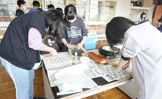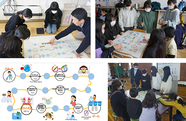 「低学年の児童にも、楽しみながら学んでもらう」をコンセプトとして、すごろく開発を行った。当初はカードゲーム開発だったが、カードのやりとりの煩雑さやルールの即時理解の難しさ等を検討し、最終的に児童が「すごろく」を選択した。役場担当者の方と協働しながら、止まったマスでもらえるカード(得点記載)の作成や、答えてもらうクイズの内容を考えていった。他のグループの児童に遊んでもらって、内容や所要時間を何度も検討しながら作成を進めていった。