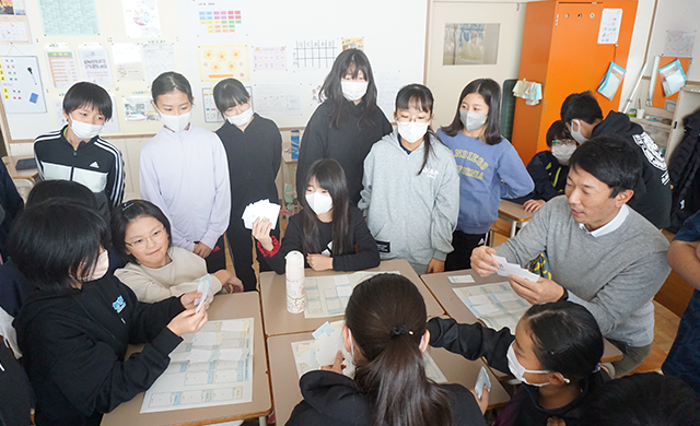 以上2つのワークショップには、役場環境担当の方も参加していただいた。町としても、「大人から子どもまでゴミ問題を広く知ってもらうためのカードゲームを開発しようと考えている」とのことだった。そこで、カードゲームの内容を考えるワークショップ型授業も行った。ここでは、役場の方が考えたベースとなるルールが小学生に適切であるかどうかの検証、ゴミ問題解決に向けた取組の中で効果が高いものを考え、得点に軽重をつける学習を行った。