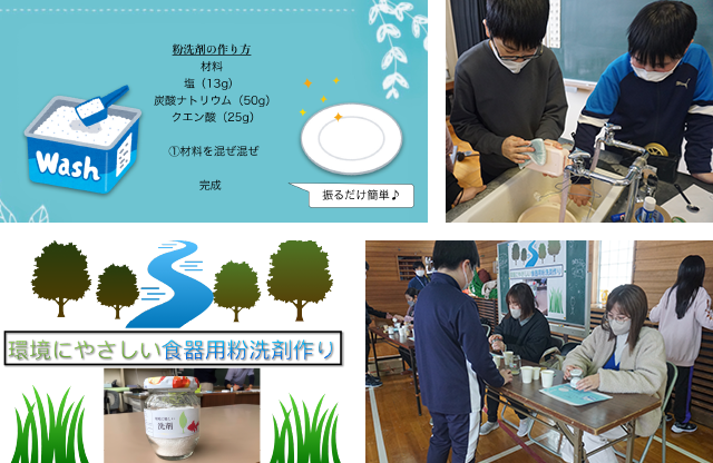 「楽しみながら環境負荷について考えてもらう」をコンセプトとして、食器用洗剤の製作体験を行うグループが生まれた。“i-Pledge”の蜜蝋ラップ製作をヒントとして、環境に優しく、かつ低学年から大人まで安全に製作できる日用品を検討した結果、「炭酸ナトリウム」、「クエン酸」。「粗塩」を使ってできる食器用洗剤作りを体験してもらうこととなった。各家庭や教職員の協力に協力を仰ぎ、空きビンを集め、タブレット端末を用いて作成したラベルシールを貼って洗剤を入れる容器とした。