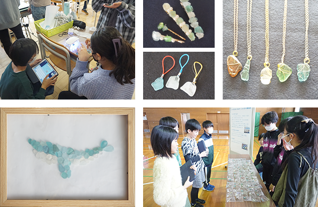 「ゴミを用いたアクセサリーを紹介し、環境問題について知ってもらおう」をコンセプトに、製作したアクセサリーを無料配布するグループができた。シーグラスとは、海のゴミの一種であり、ガラス製品が波に揉まれて角が取れたガラス片のことである。来場した方に、人間が作り出したゴミが海に流れ出ている実態を知ってもらうこと、また、低学年の児童もゴミ問題について関心を高めてくれることを期待して準備を進めてきた。