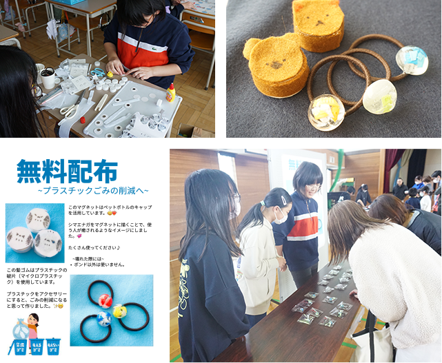 「ゴミを用いたアクセサリーを紹介し、環境問題について知ってもらおう」をコンセプトに、プラスチックとマイクロプラスチックを用いた小物を作り、配布するグループも生まれた。マイクロプラスチックとは、微細なプラスチックの総称であり、直径5mm以下のものを指す。近年、マイクロプラスチックによる海洋生態系への影響が懸念されており、人間の出したプラスチックゴミのうち、1/3は海へ流れ出てしまっているという調査結果も、第一次の学習で環境活動家の方から子どもたちは学んでいた。