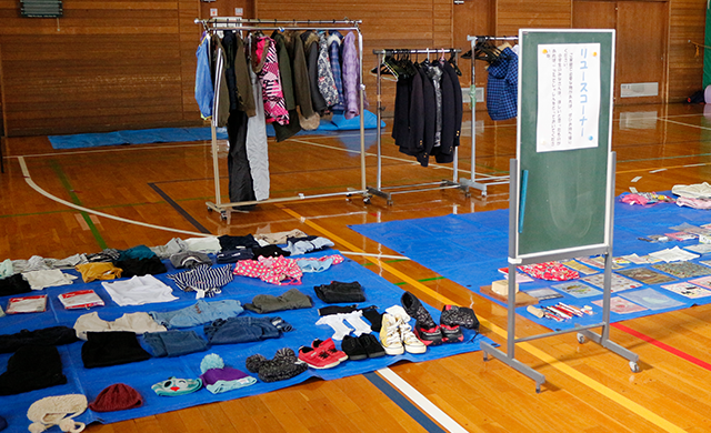 6つのワークショップ以外にも、「リユース品を集めて必要な人に持って帰ってもらう」というアイデアも、児童から生まれていた。そこで、「衣服」、「防寒着」、「スキー用品」、「靴」、「文房具」に絞って、児童の家庭、地域のNPO法人“子どもサポート”に協力してもらい、およそ1ヶ月間、リユース品を集めることとなった。イベント当日は、用意したもののうち1/5程度のリユース品を持ち帰っていただくことができた。残ったリユース品は、一定期間“子どもサポート”の施設に置いてもらうこととなっている。