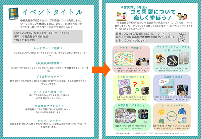 多くの方々と出会いながら、「自分たちにできること」を問い続けてきた子どもたち。中富良野町のゴミ問題解決のためにできることを話し合い、学習のゴールを「イベントを企画し、中富良野町民に向けて発信すること」と決定した。対象は、「町民の方々」、「保護者」、「下級生」とし、発信対象に合わせたワークショップ内容を整理、分析した。その結果、以下の6つのワークショップを行うこととなり、グループごとに分かれて準備を進めた。今までに体験したワークショップを生かし、児童が創造的に内容を考えていった。