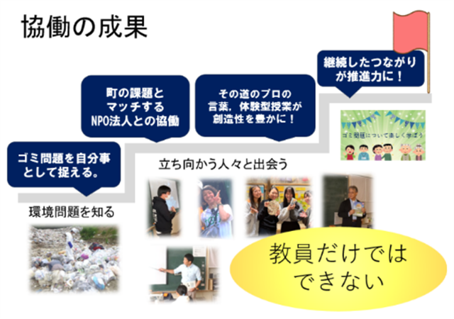 「ゴミ問題」という町の課題とマッチするNPO法人に協働してもらえたことが、児童の主体性を育み、深い学びへと繋がっていったと考える。その道のプロの言葉、ワークショップ型の体験授業がヒントとなり、創造的な活動へと繋げることもできた。