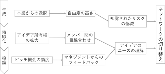 さらに、ピッチ(承認者へのプレゼンテーション)の頻度が高いと、必要な改善点や資源、アイデアの位置するジャーニーの段階を理解するのに役立ち、適切なネットワーク構造の切り替えにつながる。つまり、ピッチによってアイデアを事業化するためのフィードバックを得やすくなり、アイデアのニーズに応じたネットワークの活性化が可能になる。さらに、ピッチ機会はアイデアの具現化活動に対して時間的な制約を設けるため、プロジェクトのペースメーカーとしての役割をも果たす。