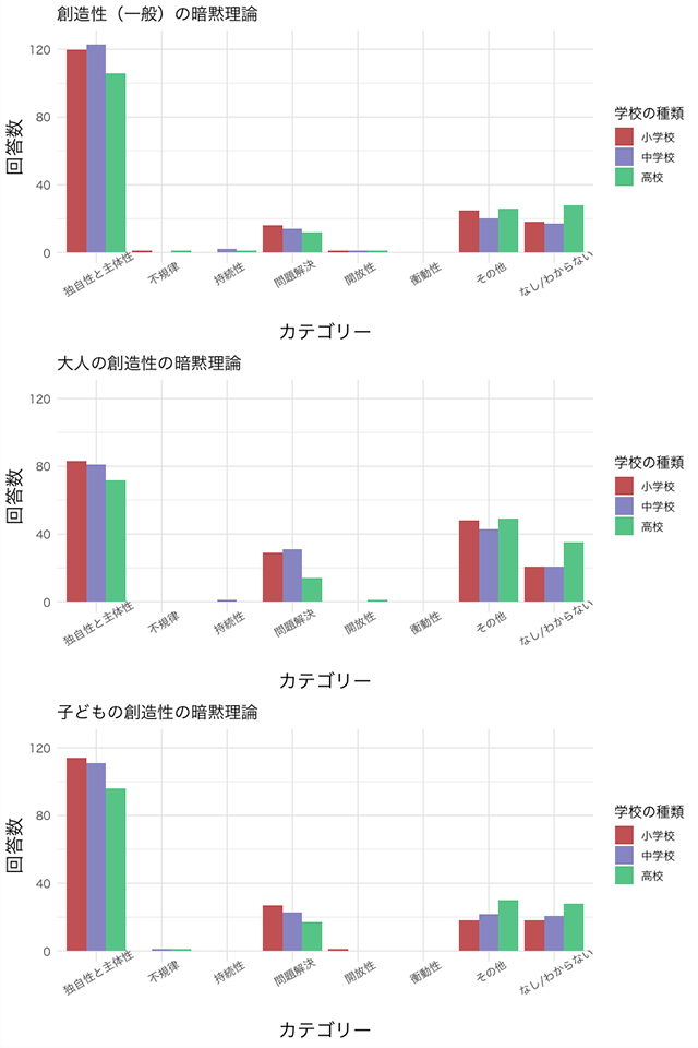 創造性の暗黙理論に関する記述の内容は、独自性と主体性に関する内容が最も多く、次に問題解決に関する記述が多かった。これらの結果は、外国の教師を対象とした創造性の暗黙理論の調査の結果とも一致しており (Gralewski, 2019; Gralewski & Karwowski & 2016; Karwowski et al., 2020)、独自性と主体性や問題解決が多様な文化に共通して教師のもつ創造性の暗黙理論の一部であることを示唆する。
