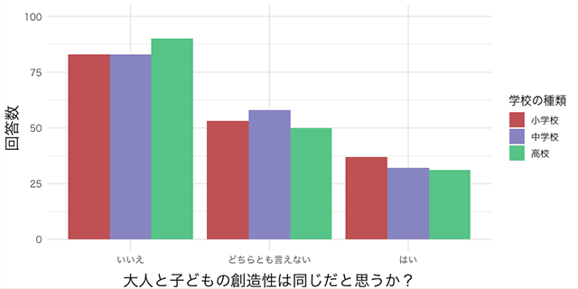 - “あなたにとって大人と子どもの創造性は同じだと思いますか?” (いいえ、どちらとも言えない、はい)。