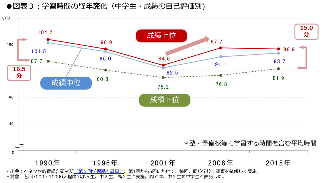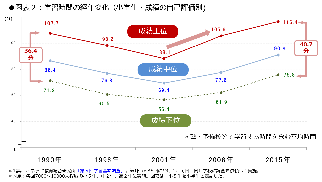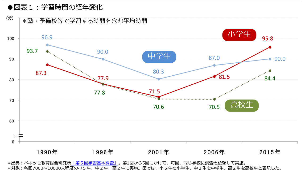 これを見ると、いずれの学校段階でも1990年から2001年にかけて学習時間は減少し、その後、2015年にかけて再び増加する軌跡を描いている。学習回帰だ。