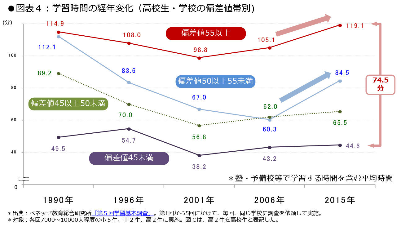 それを確認するために、成績による学習時間の違いを時代の推移とともに見てみよう。図表2は小学生、図表3は中学生について、成績の自己評価別に学習時間の平均を示した。また、図表4は高校生について、在学する高校の入学偏差値別に平均を示した。