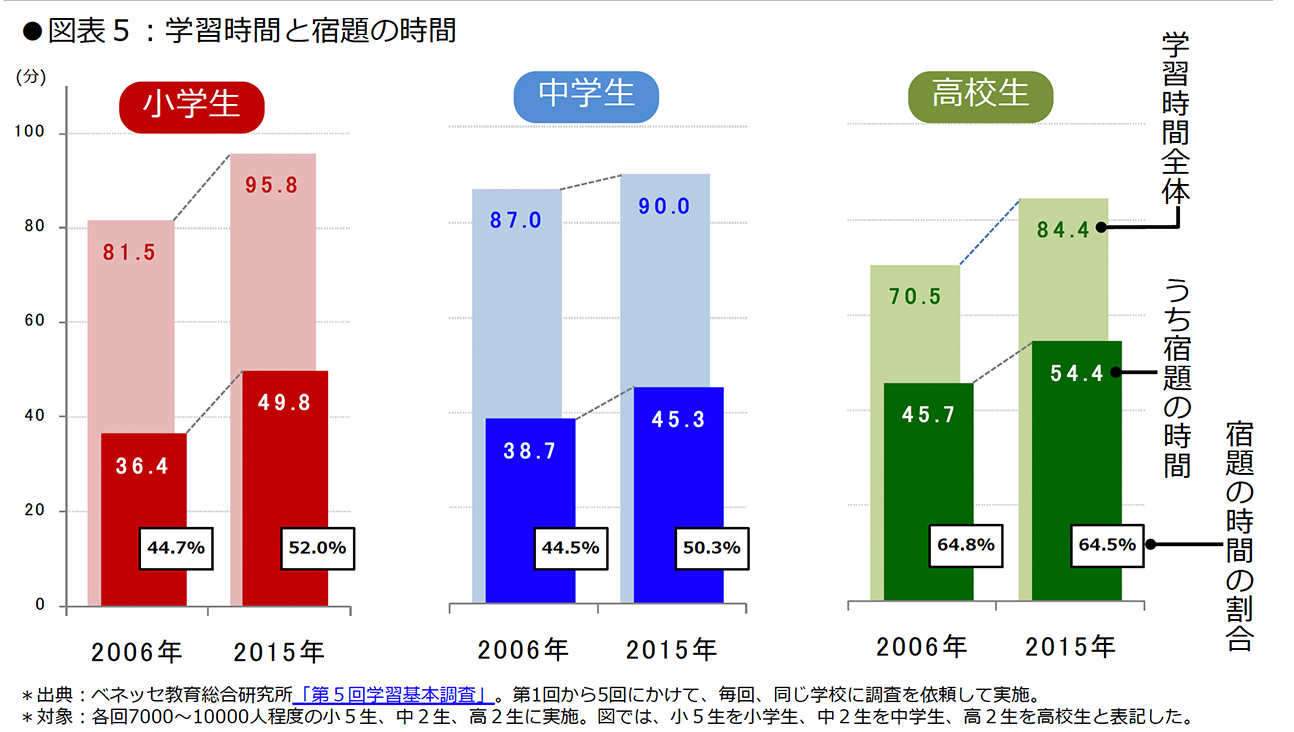 宿題の時間については、2006年と15年のデータしかないため、2時点の変化を図表5に示した。ご覧いただくとわかるように、学習時間全体は伸びているが、そのほとんどを宿題の増加で説明できてしまう。全体に占める宿題の割合は、小中学生で約5割、高校生では6割を超える。データは割愛するが、高校では偏差値帯上位の学校で宿題の時間が増えている。大学への進学実績を高める必要が、そうした高校で強いのだろう。