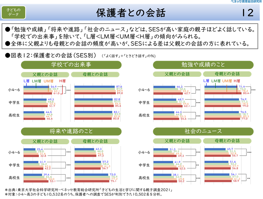 保護者との会話の中身が、SESによって異なるということもある。図表12は、子どもに保護者との会話の頻度をたずねた結果(「よく話す」+「ときどき話す」の比率)である。これを見ると、「学校での出来事」のような話題はSESによる差がみられないが、「勉強や成績のこと」「将来や進路のこと」「社会のニュース」には有意な差がある。とくに、父親との会話に、SESによる差が表れている。