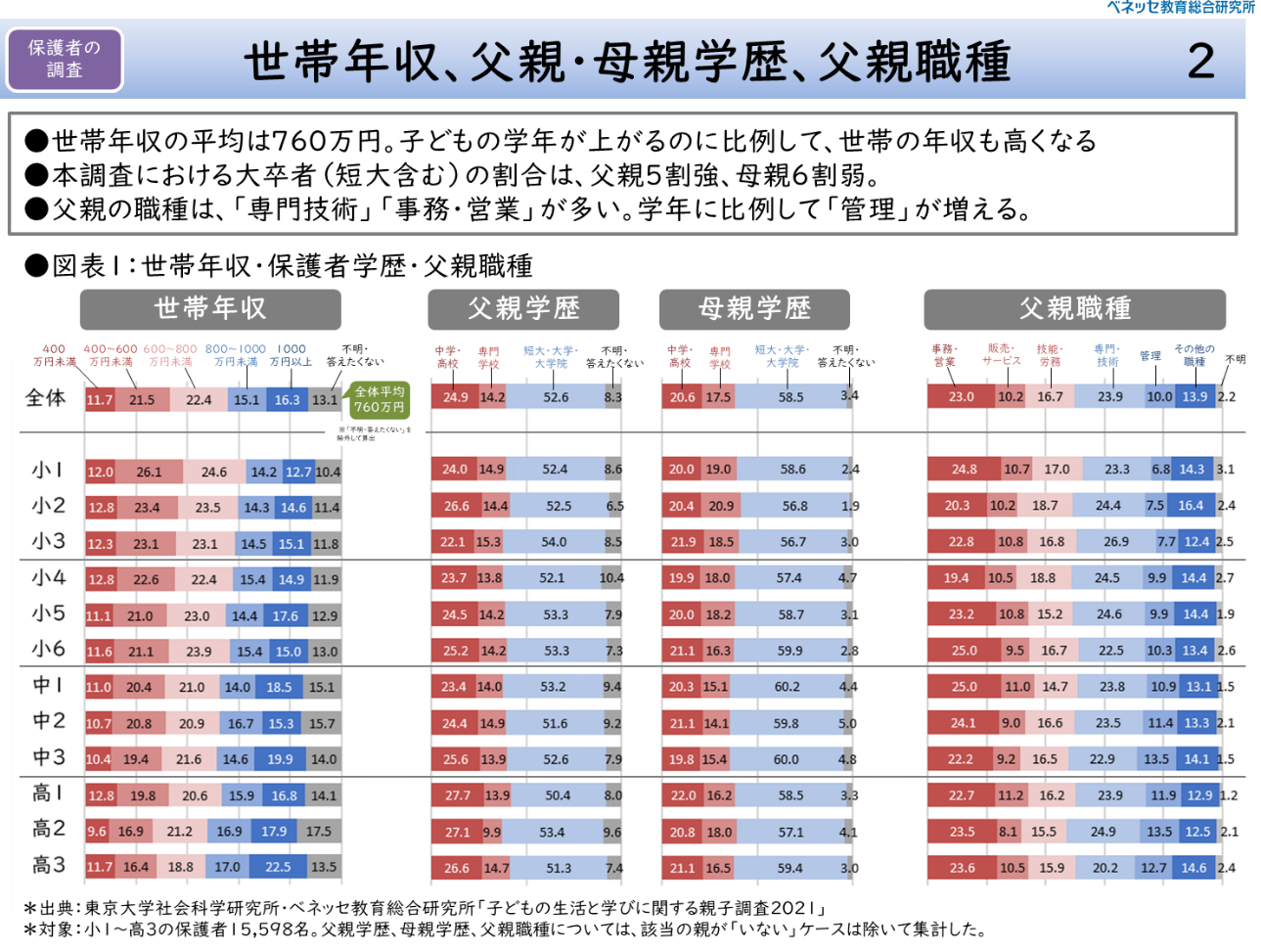 図表1は、「世帯収入」「父親学歴」「母親学歴」「父親職種」を学年別に示したものである。世帯年収の平均は760万円であるが、国民生活基礎調査(2018年度)の18歳未満の子どもがいる世帯の平均所得は746万円である。所得は年収よりも低くなることから、世帯年収の平均が760万円というのは一般的なサンプルと言える。ただし、父親/母親の学歴は推定される大卒比率(40%弱)からすると高い傾向にあり、やや教育熱心な層が多い可能性がある。