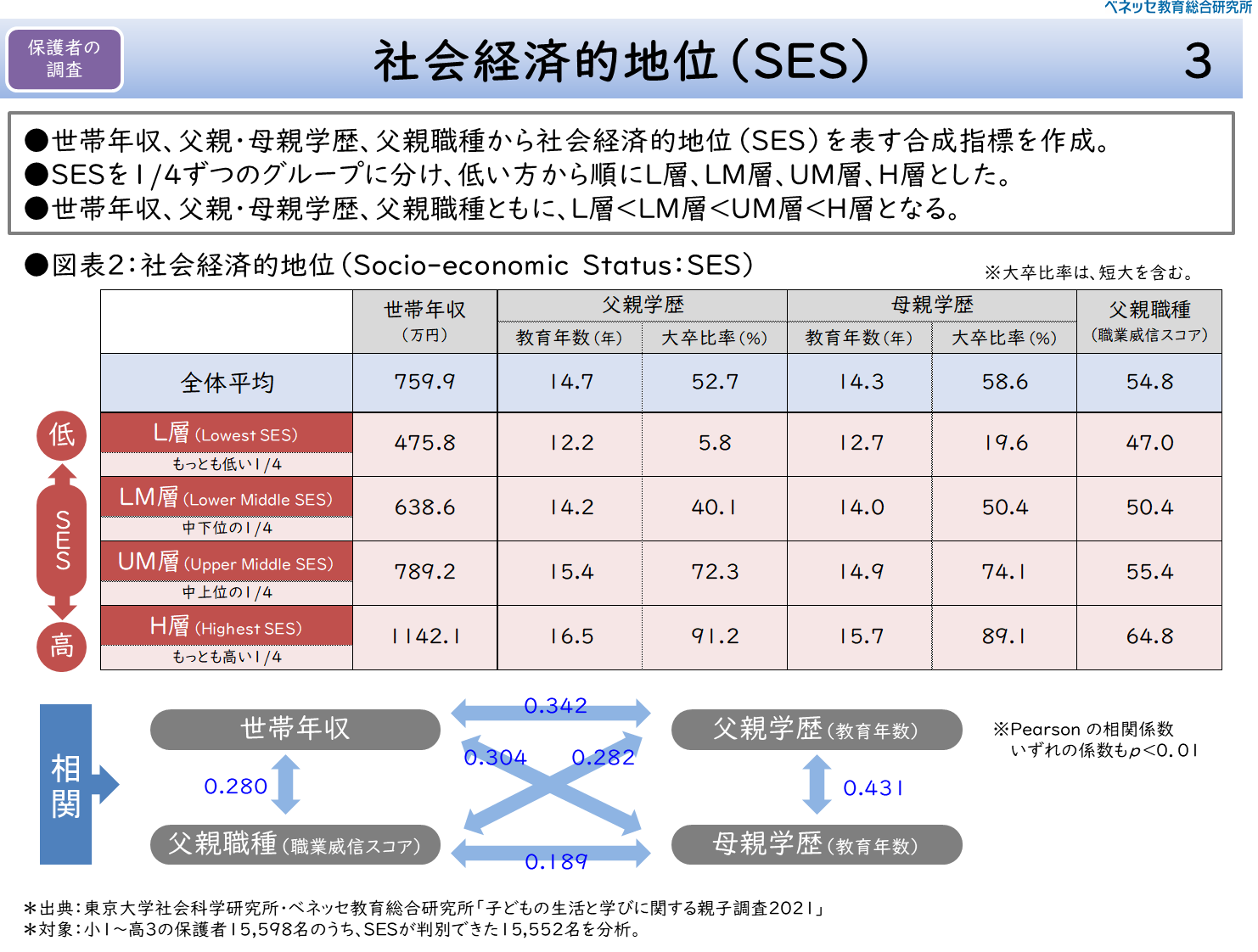 4段階については、もっとも低い層をL層(Lowest SES)、次に低い層をLM層(Lower middle SES)、上から2番目に高い層をUM層(Upper middle SES)、もっとも高い層をH層(Highest SES)と名づけた。今回紹介するデータのほとんどは、この4層別に示している。