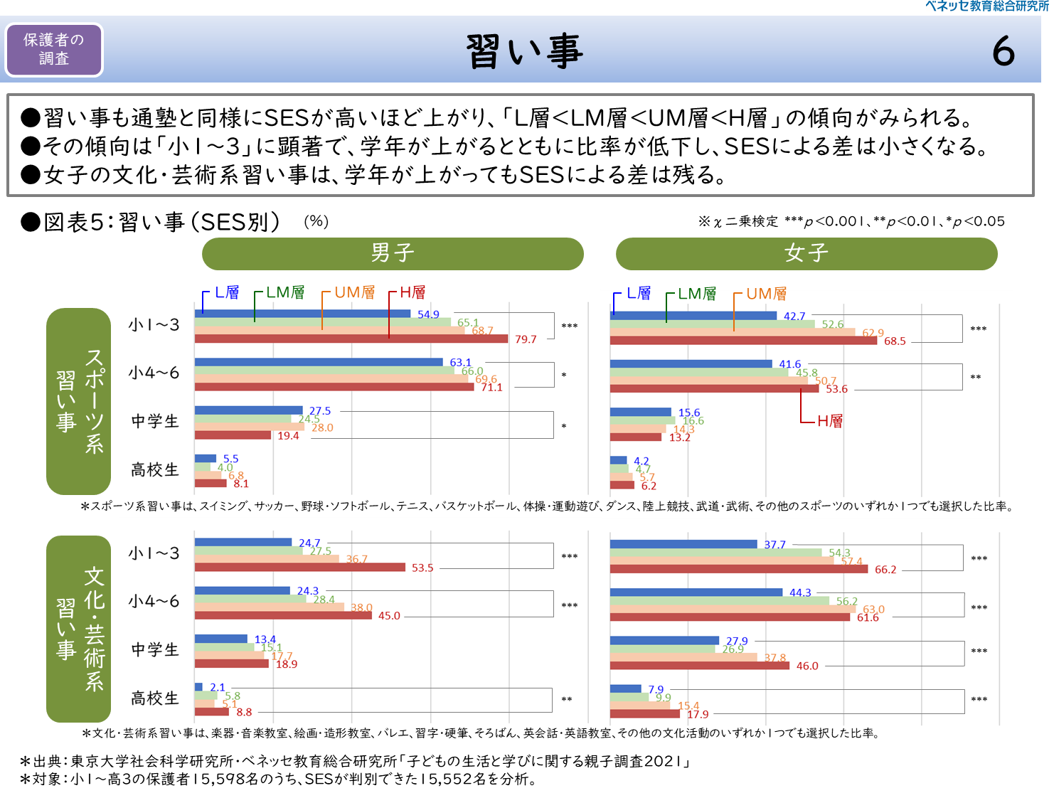 格差があるのは、通塾のような学習面にとどまらない。スポーツや文化・芸術といった習い事の機会にも、SESによる違いがある。次に、習い事に関するデータ(図表5)を見てみよう。習い事は、男子にスポーツ系、女子に文化・芸術系が多いため、それらを分けて示した。
