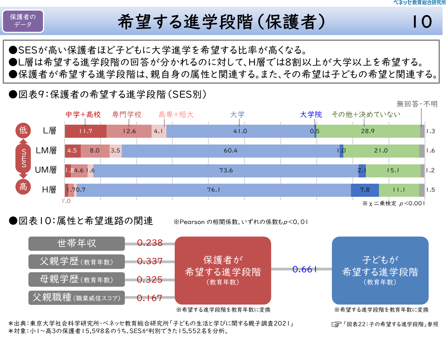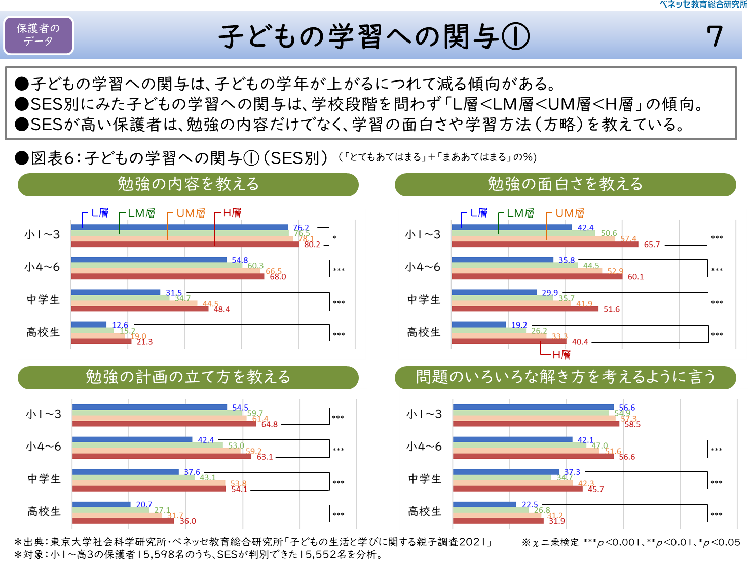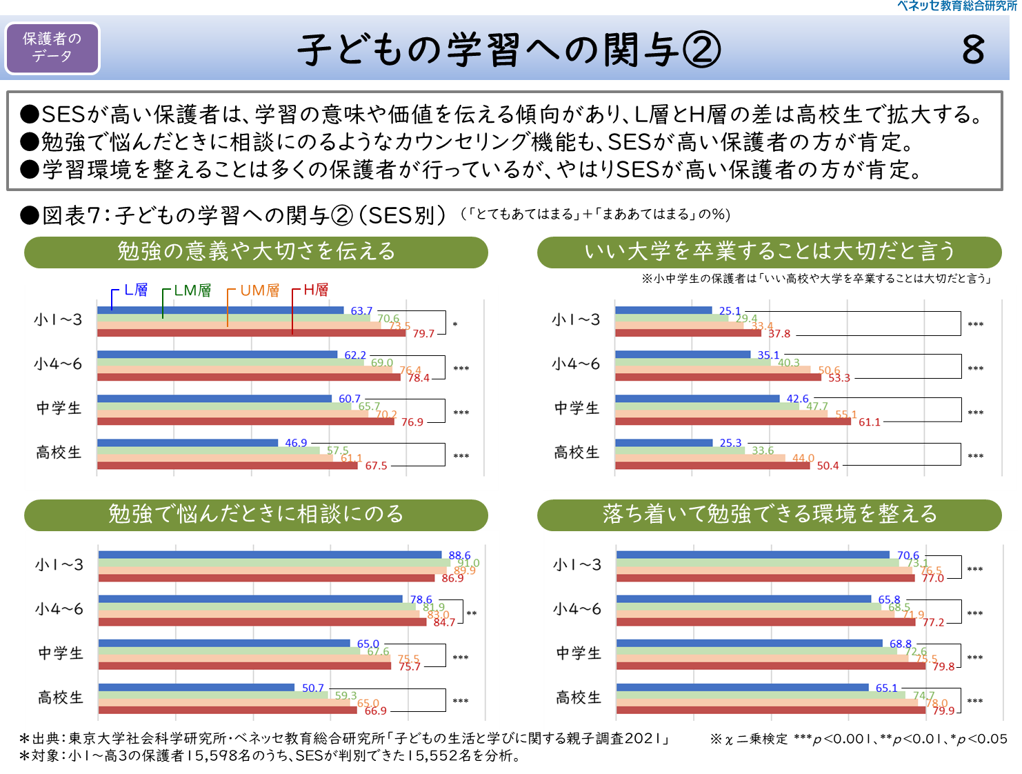 以上のようなSESの各層のプロフィールを踏まえて、順に保護者の教育に対する意識や行動に関するデータを見ていきたい。