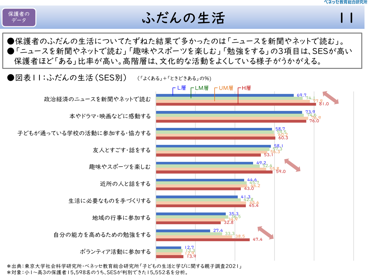 最後に、そもそも保護者自身のふだんの生活にSESによる差があって、日ごろの子どもとの会話の中で、そうした価値観や態度が伝達されている可能性に言及しよう。