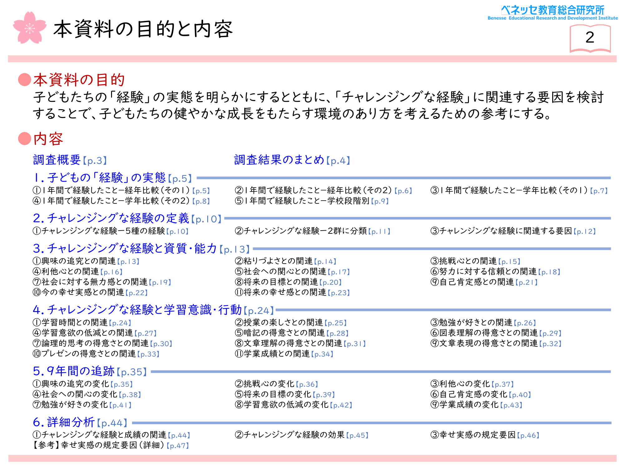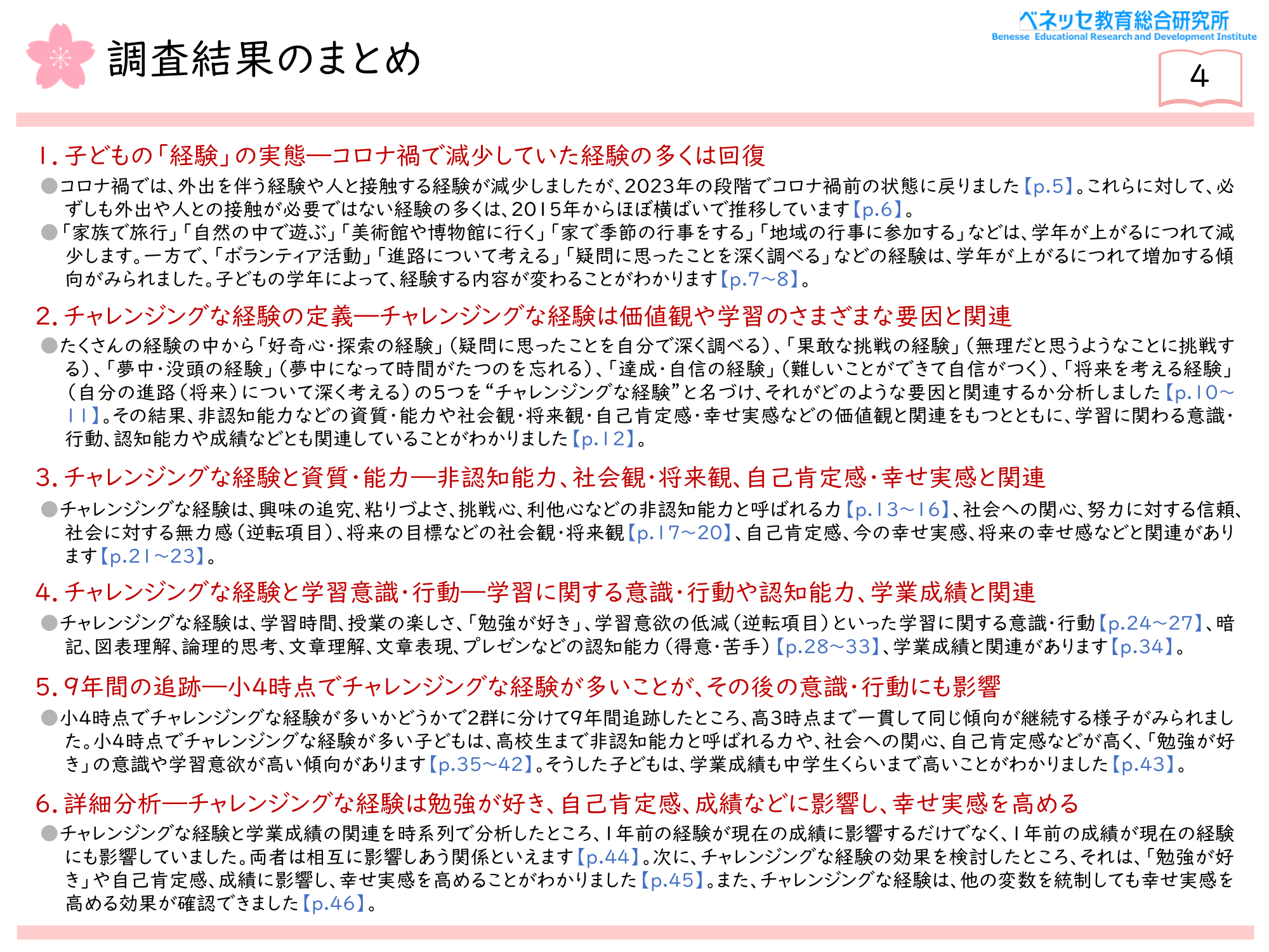 国内外の研究者・実践者のみなさまとともに、子ども・保護者・先生、一人ひとりの成長の仕組みを解明するエビデンスを創出し、人の成長や学びに関連したさまざまな調査研究を行い、その報告書や調査データなどを公開しています。