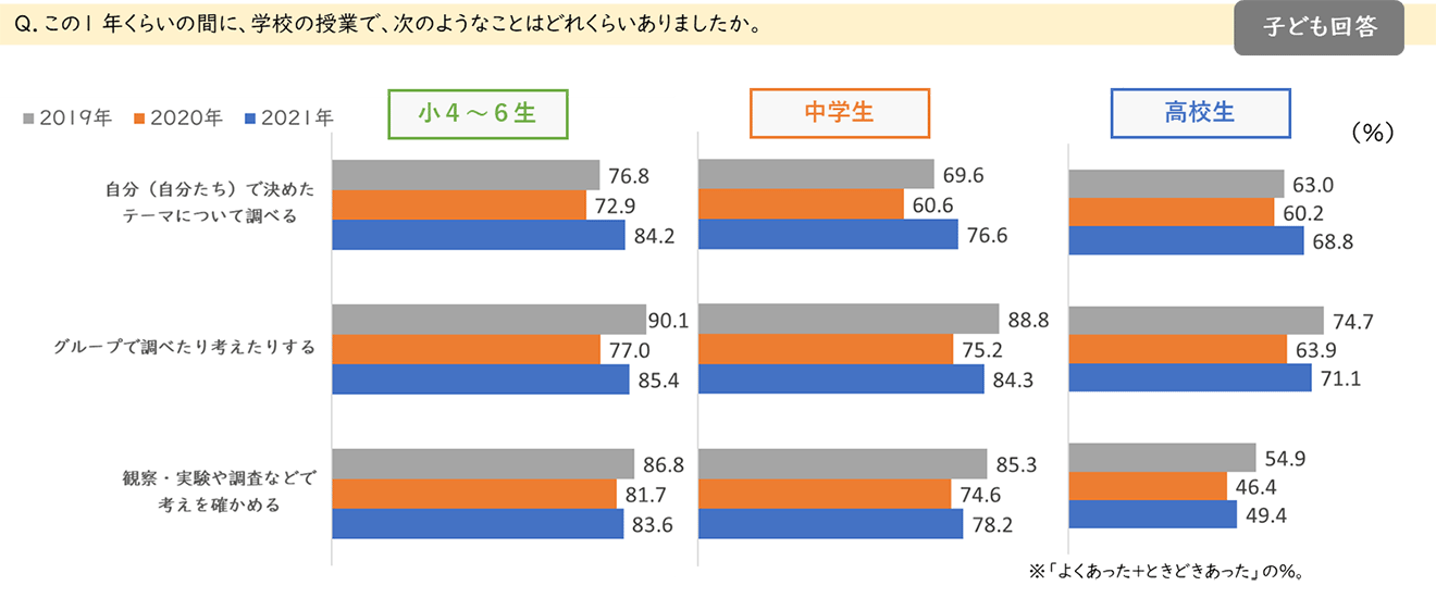 まず、①について見ていきます。2020年は、学校の授業において「自分(自分たち)で決めたテーマについて調べる」「グループで調べたり考えたりする」「観察・実験や調査などで考えを確かめる」といったアクティブ・ラーニング型の取り組みが減っていました。しかし、2021年には実施率が回復傾向にあり、各学校が感染拡大防止の工夫をしながら、アクティブ・ラーニング型の授業を再開している状況が見て取れます(図1)。