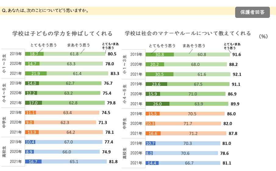 次に、学校に対する保護者の意識について「学校は子どもの学力を伸ばしてくれる」や「学校は社会のマナーやルールについて教えてくれる」に「とても+そう思う」と回答した保護者が、2019年から2020年にかけて減少したものの2021年にかけては増加しました(図2)。休校を契機として、学校は学力を養う場であることはもちろん、生活リズムをつくり、社会のマナーを身に付ける点でも重要な役割を果たしていると考えるようになった保護者も多かったようです。