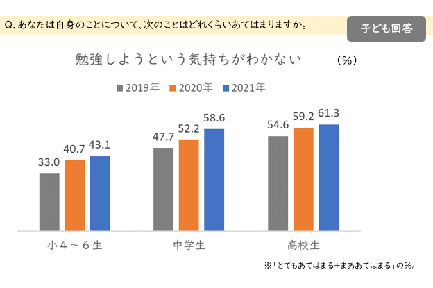 「勉強しようという気持ちがわかない」に、「とても+まああてはまる」と回答した子どもの割合は、小・中学生・高校生ともに、2019年、2020年、2021年と増加しています(図3)。その一方で、「宿題をする」「学校以外の勉強をする」といった子どもたちの勉強時間には変化がありませんでした(図表省略)。以前ほど学習意欲が高まらない中でも、いままで通りに勉強を続けている子どもたちの状況が明らかになりました。