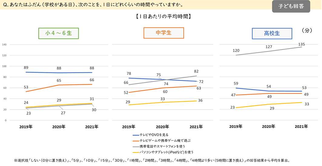 1日の時間の使い方では、メディアの使用時間に注目します。2020年ステイホームの影響により増加した「テレビゲームや携帯ゲーム機で遊ぶ」「携帯電話やスマートフォンを使う」「パソコンやタブレットを使う」時間は、2021年も増加したままでした(図4)。屋内で過ごす時間が増えていることや、中学生で自分専有のスマートフォンの所有が増えていること(図表省略)、一部の子どもたちはGIGAスクールによって学校から配布された端末を持ち帰るようになったことも影響しているでしょう。