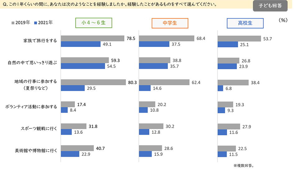 一方で、リアルな場での体験は減少しています。「家族で旅行をする」「自然の中で思いっきり遊ぶ」「地域の行事に参加する(夏祭りなど)」「ボランティア活動に参加する」「スポーツ観戦に行く」といった社会的、自然的体験は2019年と比べて大きく減少しました。また、「美術館や博物館へ行く」といった文化的体験も同様に減少しています(図5)。
