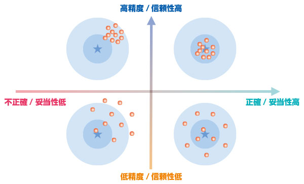 何回か投げてもだいたい同じ場所に当たる ってことですよね。でも信頼性が低いテストだと、下段の2つの円のように、当たる場所がバラバラ。