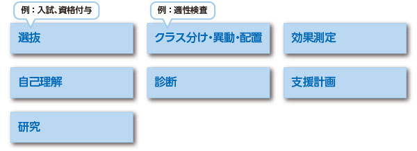 テストを使用する際には、必ず目的があるはずです。実際にテストを使用する前に、まず、その目的を明確にしておくことが重要です。もし目的に対して、あるテストだけでは満足な評価ができないと考えられる場合には、たとえば面接や実技などの他の手段に変えたり、あるいはそれらと併用したりする必要が出てきます。
