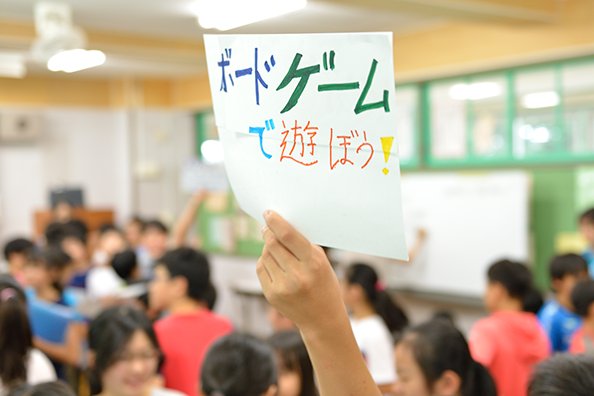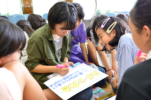 「幼稚園生と交流したい」「スポーツ大会を開きたい」「ブックカフェを開きたい」など全15チームができた。少ないグループは2人、多いグループは20人ほどのメンバーを集めていた。グループで活動内容、目的などを話し合わせ、一つの画用紙にまとめさせて、授業は終了した。
