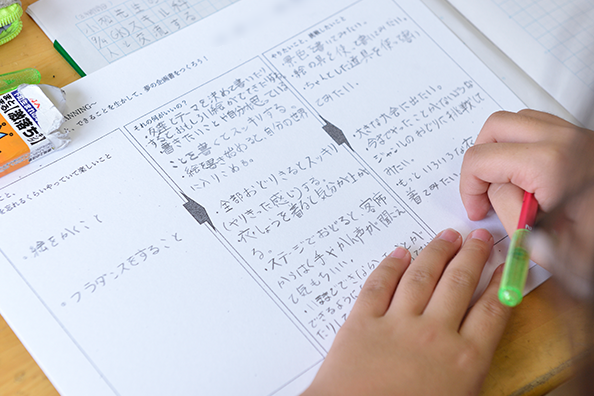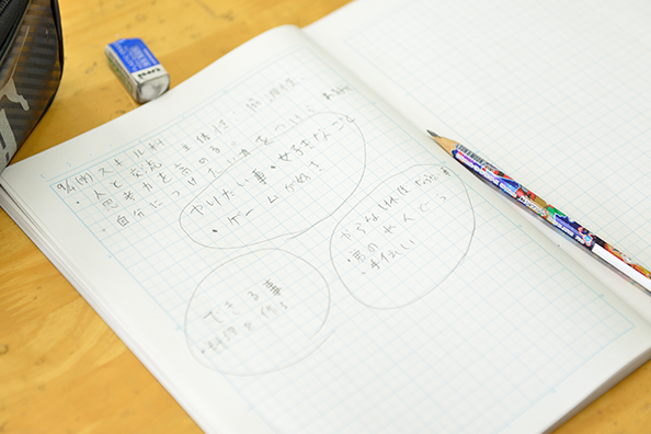 子どもたちはノートに3つの丸を書き、「できること」「やりたいこと」「やらなければならないこと」を5分程度でまとめた。時間内に3つとも書けたのは1人だけだった。「やらなければならないこと」は書けた人が8人いたが、「やりたいこと」や「できること」が書けた人はそれぞれ数人で、書くのが難しいようだ。