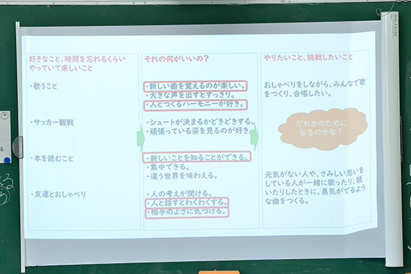 全35時間中の5・6時間目:3人のゲストティーチャーから聞いた話を踏まえ、各自が自分の「好き」を見つめ、大切にしたい価値観を模索する中から、自分が「できる」ことを考える。そして、他者への「貢献」という視点で、本当に取り組みたい課題や目標を考え、挑戦したいことを企画カードにまとめる。