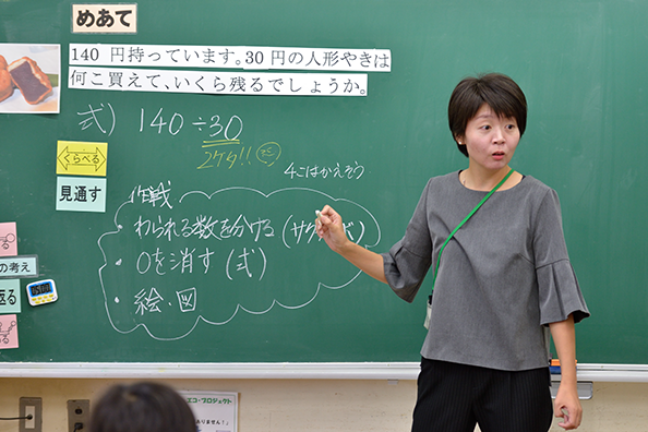 清水先生は、「140円持っています。□円の人形焼きをいくつ買えますか?」という問題文が書かれたシートを黒板に貼り、問題文の空欄に入る金額はいくらになるか子どもたちに質問した。子どもたちからは、「30円」「50円」という声が上がる。