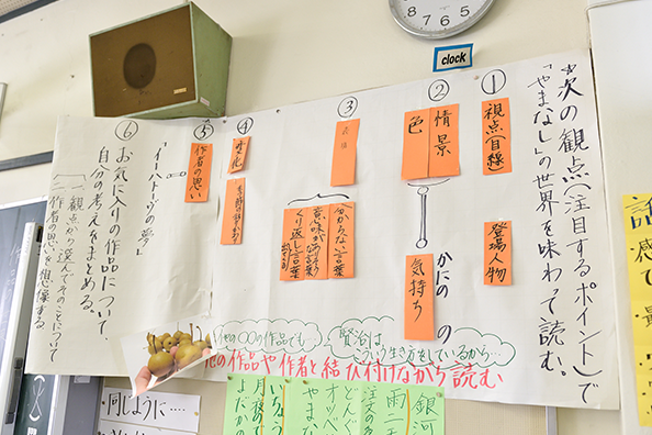 「学習計画をクラス全体で立てたあと、『やまなし』を読んでいきました。もし、子どもたちに考えさせるのではなく、私が『色に注目して読んでください』と言ってしまうと、「なぜ色に注目するの」という点に引っかかってしまい、読みが主体的なものにならず、その後に友だちと意見交換する際も話し合いが深まりません。できるだけ子どもが主体的に学びに向かうよう授業を組み立てています」(佐藤先生)