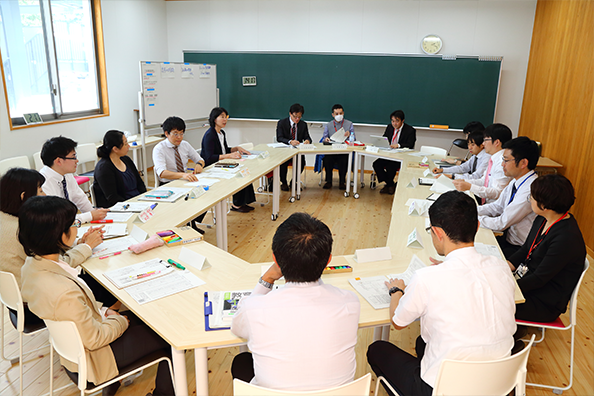 田尻先生が進行役を務めたグループでは、柞磨氏ら研究会のメンバーに加え、第二高等学校の数学・理科・家庭科の教員、計16人が参加。当日の授業の様子や「見せどころシート」の内容を基に、生徒に主体的な学びを促す問いかけについて議論した。