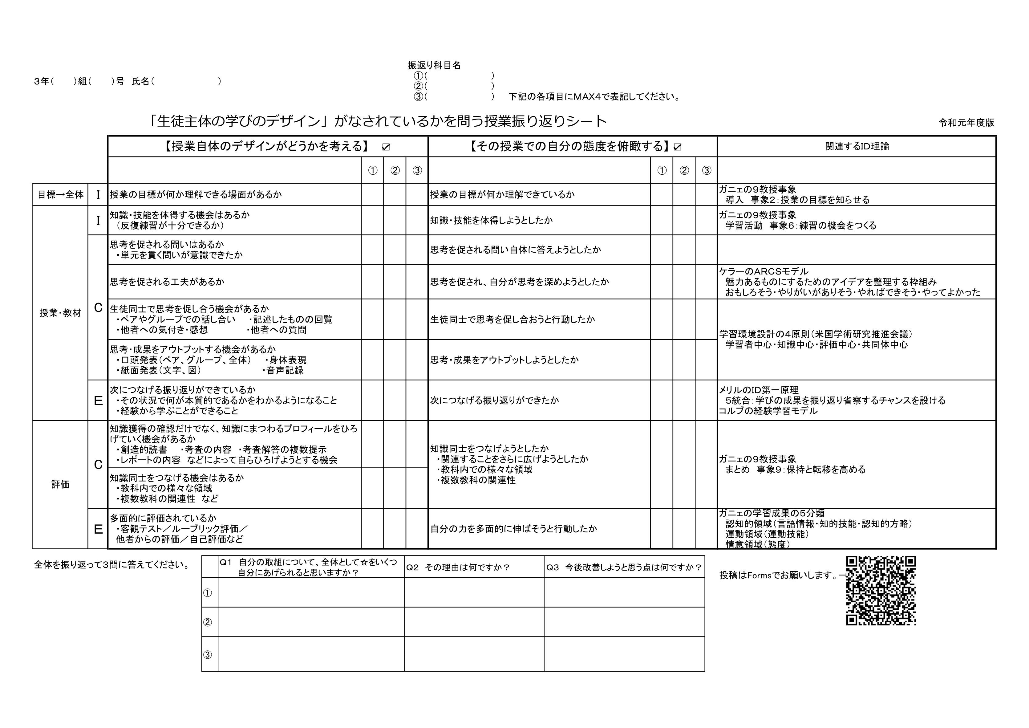 図3 「『生徒主体の学びのデザイン』がなされているかを問う授業振り返りシート」