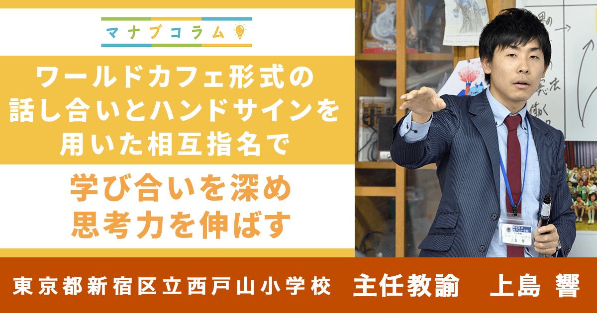 それは上島先生が、そうした形式の話し合いを授業でよく行うため、このような発言が子どもから自然に出てきた。この形式は、「ワールドカフェ」と呼ばれ、ワークショップで用いられる討議の手法だ。参加者が少人数に分かれたテーブルで自由に対話を行い、途中でメンバーをシャッフルしながら話し合いを発展させていく。