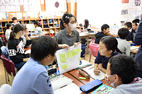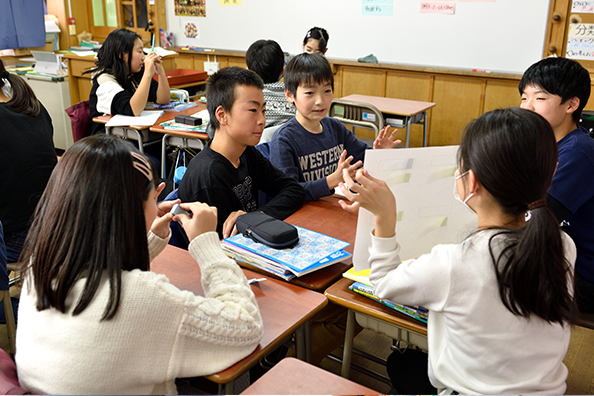 「グループの代表が前に出て話し合いの結果を発表するスタイルの方が、『みんなの意見が聞けて良い』という子どももいます。一方、『ワールドカフェ』では、自由にいろんな人と意見を交換します。話す相手によって内容や言葉、伝え方も工夫することができるため、意見交換しやすいという声を聞き、授業に積極的に取り入れるようになりました」(上島先生)