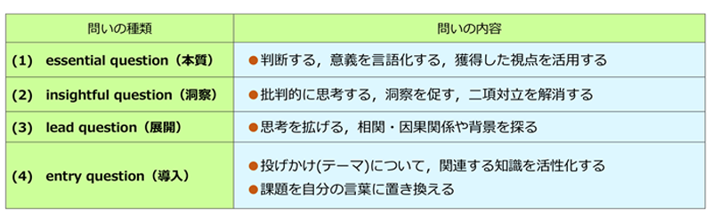 question(気づきや洞察を生む問い)、essential question(本質目標に迫る問い)の4つをセットにして活用します。授業では、entry