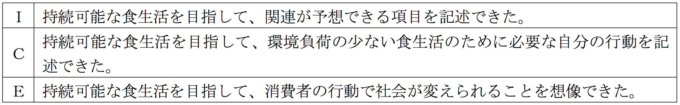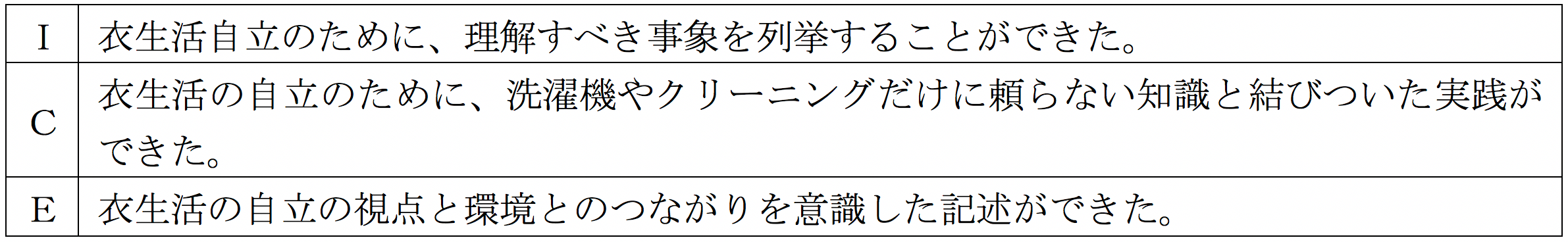 このように、生徒が主体的に課題解決に取り組む仕組みを家庭科は備えているが、それを「意識させて」一層深く取り組ませるための重要なツールとして、ICEモデルを活用したいと考えたのが始まりである。そこで最初に取り組んだのが、ホームプロジェクトのルーブリック評価表内にICEモデルの視点を取り入れることである。学びの質の変化をデータとして追い、取り組みが深い学びにつながるとの仮説に基づき、実践を継続している。
