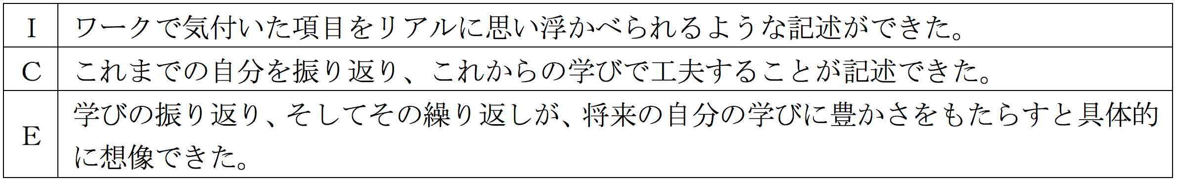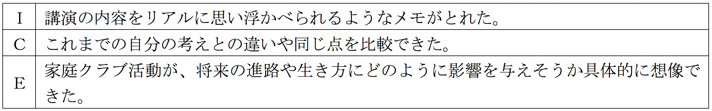 本校では、家庭クラブ活動やSSHをはじめとする講演会、LHR等において、気付きや感想を記述する場面が多い。生徒の思考を一層深いところへ主体的に導くためには、教師がその場面に応じた足場掛けを準備することが必要であり、生徒の意識を高めることにつながる。その足場掛けとしてICEモデルの視点のチェックリストを作成する取り組みを行っている。本校ではこの仕組みを、eポートフォリオ作成にもつながる取り組みとして位置付けている。