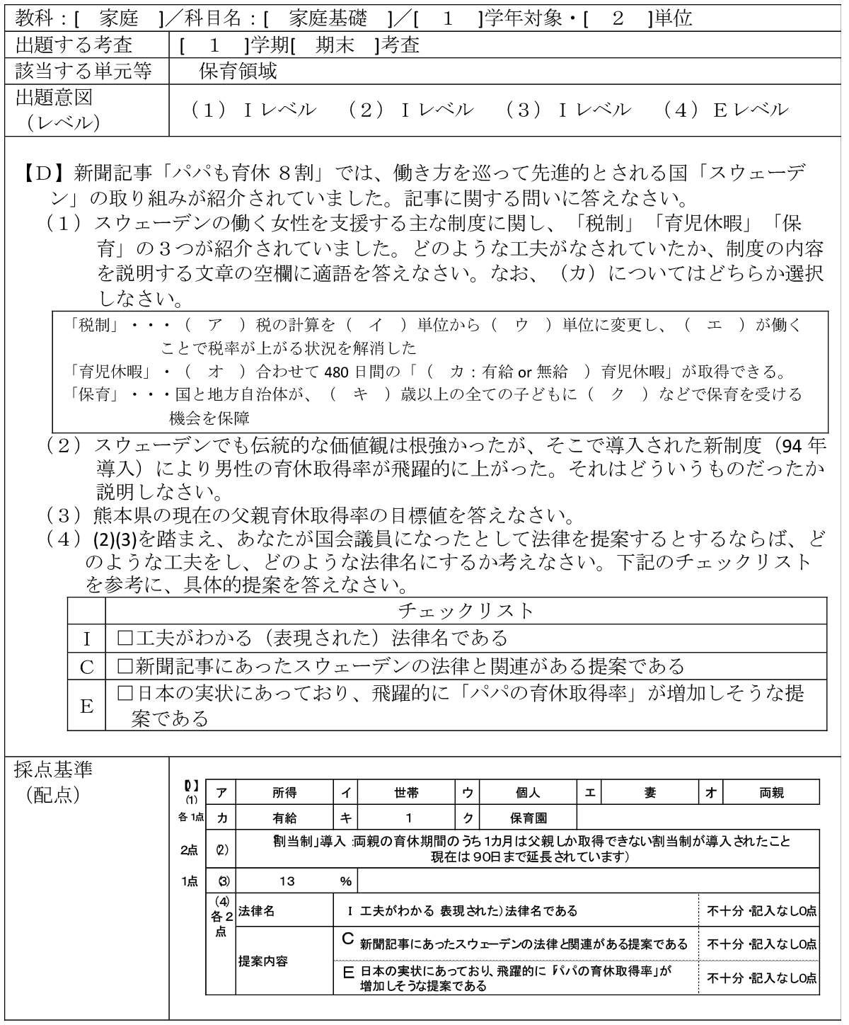 Eレベルの問題として、家庭科では「他者へ伝える・説明する」ことや「問題解決へ向けた発展的アイディア」など、視点が広がる方向を想定している。答える時間の速さや多さを求める考査スタイルとは対極に位置するともいえる出題スタイルを目指しているため、50分という考査時間を有効に使うための工夫も取り入れた方法を考えている。具体的に下記の出題例では、事前に提示した新聞記事を読んでくることを前提として、その上で考査において解答する形式とした。この記事自体が、自分で新聞記事を選ぶという課題の生徒の取り組みを基にしており、自分達の中にそのような新聞の読み方ができ、選択できる人がいるのだというメッセージを込めた。