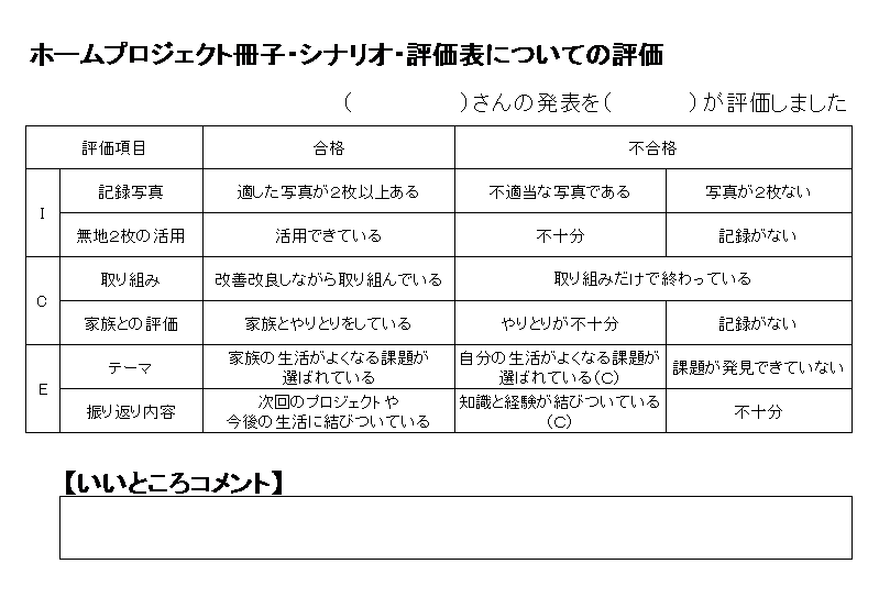 下記にグループ内での相互評価に使用する評価表を示しているが、評価項目をICEで分類して表記し、それぞれどこに該当するのかをマーカーで塗る形で評価するという使い方をしている。塗るだけで評価が終わるので、簡単で取り組みやすい。合格・不合格という区切りにしているのは、段階を付けることで「このくらいでもよいのだという誤ったメッセージを伝えないように(ヒドゥンカリキュラムにならないように)するためである。