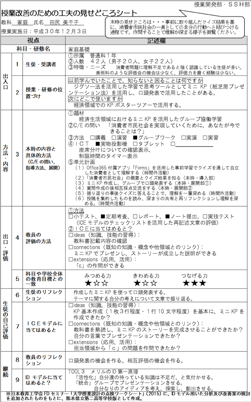 更に、職員への普及のため、広島県立祇園北高等学校の柞磨昭孝校長先生をお招きし、職員研修を実施した。ICEモデルの視点を取り入れる場面を、教科を超えて共通に使用できるものはないかと考えた。そこで、教科を越えて共通に使うツールとしてインストラクショナルデザイン(以下、ID)の視点を取り入れ、職員全員が短時間で記入できるフレーム、本校独自の「授業改善のための工夫の見せどころシート」(以下、見せどころシート)を作成することにつながった。このフレーム自体がIDの視点で作成されており、本校はICEモデルとIDを両輪として、授業改善の研究を進めている。