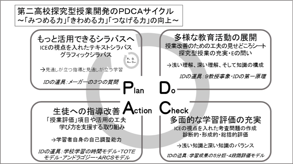 「深い学び」につなげるために、家庭科の授業にICEモデルを取り入れることから実践が始まった。その後、SSHの取り組み、学校全体での実践へとつながっている。現在、ICEモデルの視点を入れた①考査問題②記述の足場掛けのチェックリスト③ホームプロジェクトの評価表④学校独自作成の「授業改善の工夫の見せどころシート」⑤シラバス等、様々な活用法を実施しており、二高ICEモデルと表現し、活用方法の改善を継続している。