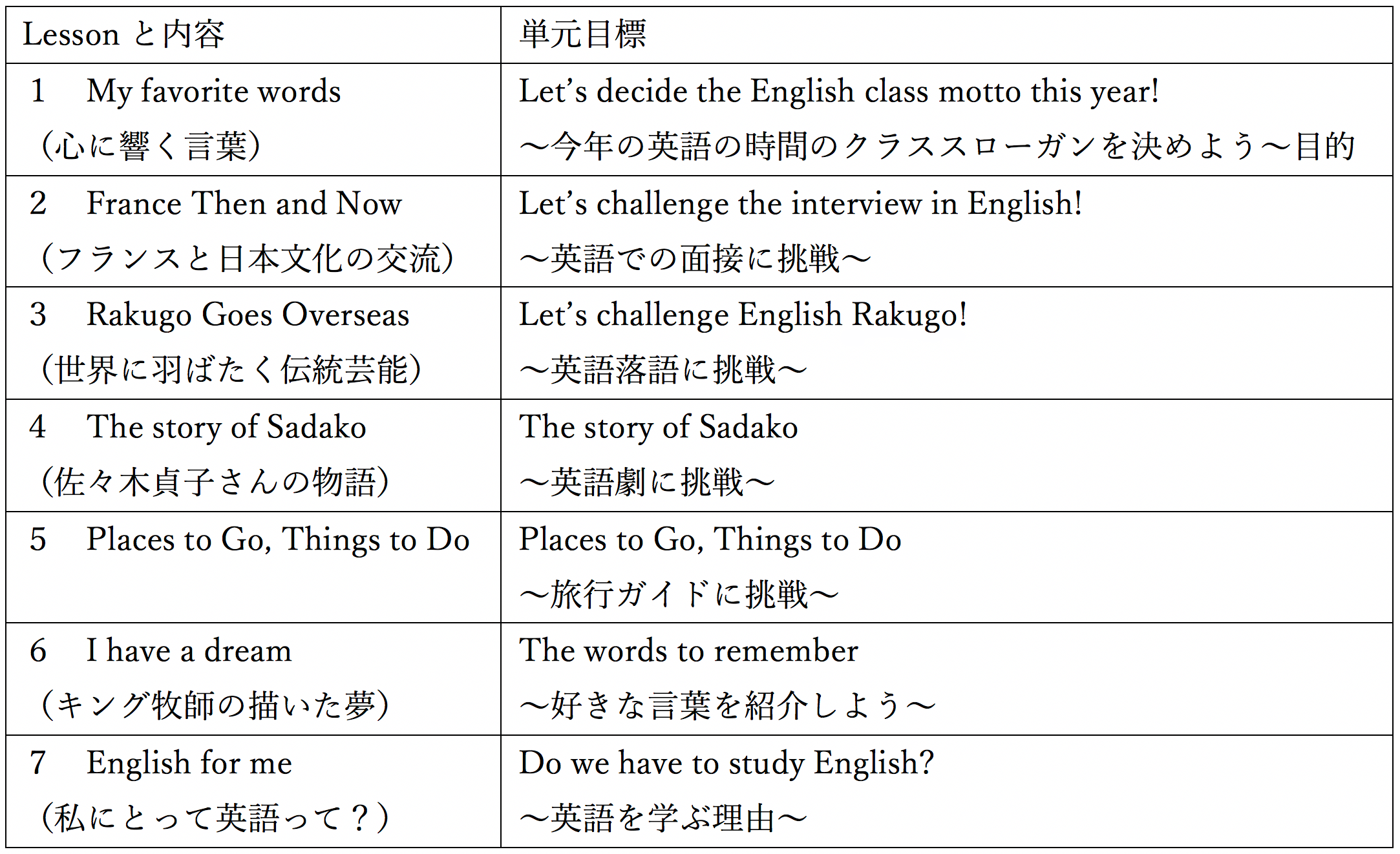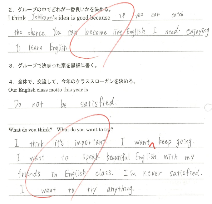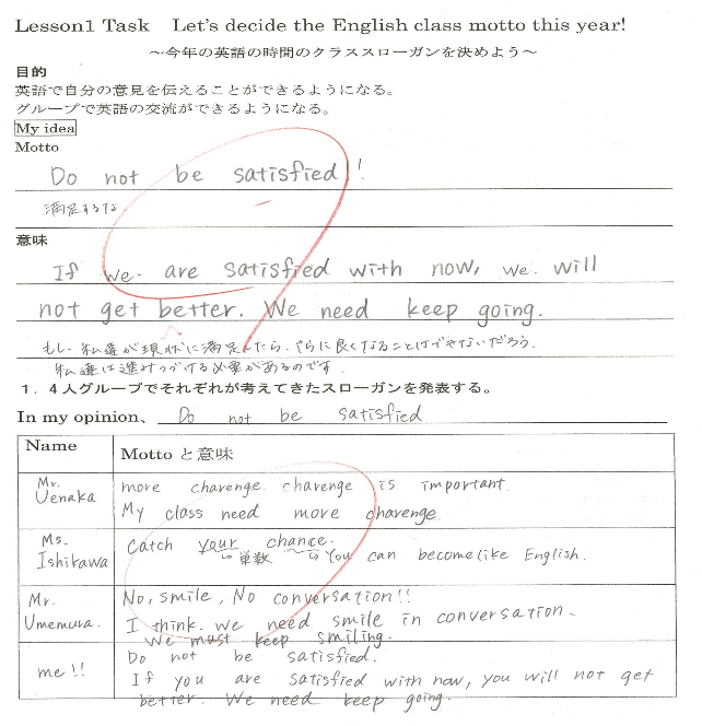 words」というテーマで好きな言葉やそれを紹介しているスピーチが題材です。私はこの単元の目的を「これから1年間の英語の授業をクラス全員でがんばるために英語で自分たちの英語の授業のスローガンを作る」としました。