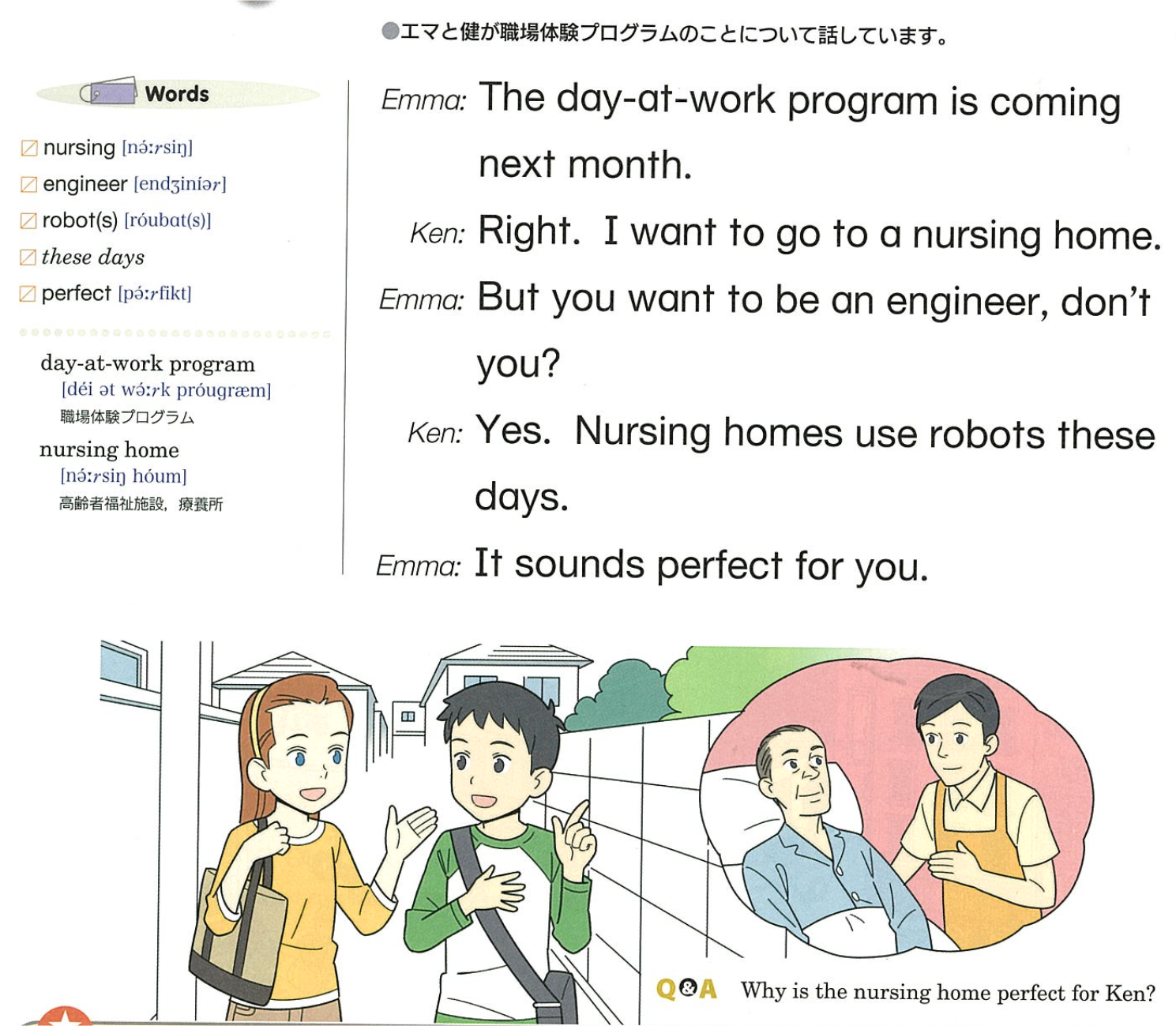 中学でのリーディングを目的とした授業で、本文の読解の理解の度合いを教師が知るために発問をすることがあります。その際教師がする発問は5W1H(いつ、だれが、どこで、何を、どのように)を聞く種類とYes-No(内容の正誤)を聞く種類が多いと思います。これはICEモデルではIのフェーズで知識や技能としてできているかの段階で、C、Eフェーズの発問も必要になります。例えば次のような教科書のページで